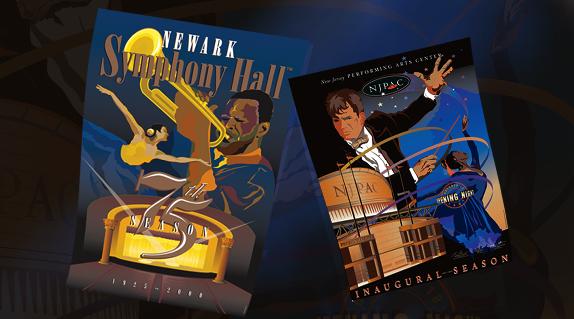 Two individual projects that illustrates the cultural landscape of northern New Jersey, a celebration of past success and the birth of future greatness. The historical Newark Symphony Hall celebrates its 75th year with this limited edition poster and New Jersey Performing Arts Center celebrate its Inaugural Season with this Opening Night Poster.