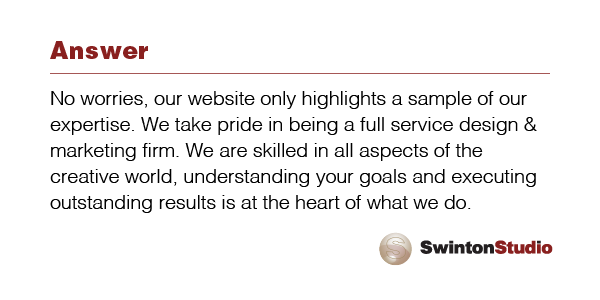 "We went to Swinton Studio to development our corporate brochure, it has proven to a strategic tool in marketing our company, we obtained multiple contracts just by handing out that brochure — excellent work…"